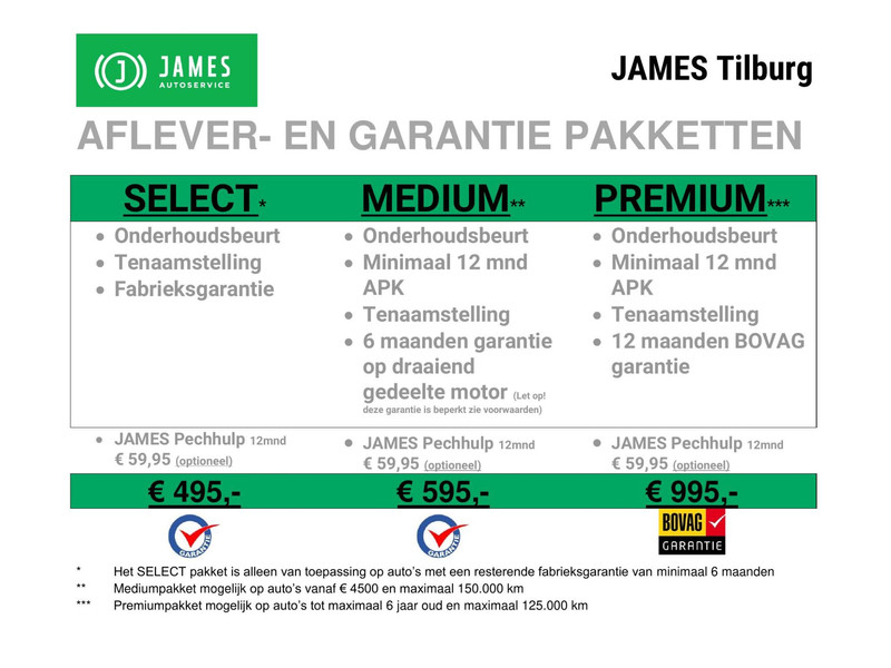 JAMES Autoservice Tilburg is al meer dan 35 jaar een begrip in TILBURG en omgeving. Kijk voor meer informatie over ons bedrijf, ons aanbod auto's en meer foto’s op onze website WWW.JAMESTILBURG.NL. Informeer naar onze aflevering- en garantiepakketten vanaf 495 euro. Alle moeite is genomen om de informatie in deze advertentie zo accuraat en actueel mogelijk weer te geven. Er kunnen echter geen rechten worden ontleend aan fouten in opties & accessoire lijst.