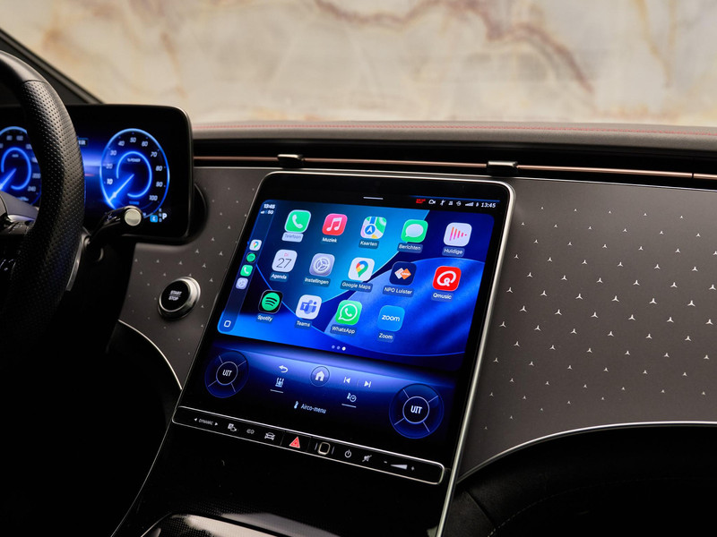 Binnenin biedt het MBUX multimediasysteem (534) met het grote 12,8” OLED-display (868) toegang tot moderne functies zoals MBUX Navigatie Premium (PBG), navigatie op harde schijf (365) en Augmented Reality navigatie (U19). Smartphonekoppeling verloopt naadloos via Apple CarPlay™ (16U) en Android Auto™ (17U), terwijl het draadloos oplaadsysteem (897) extra gebruiksgemak biedt. Het hoogwaardige Burmester® 3D-Surround Sound System (810) vult het interieur met indrukwekkende audio.