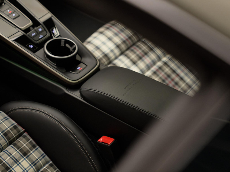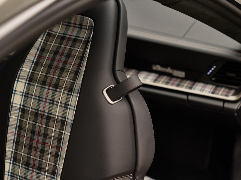 Interieur & Comfort Het interieur in zwart leder met Tartan-accenten ademt nostalgie, terwijl moderne luxe aanwezig is in de vorm van het verwarmde GT-sportstuur in Race-Tex (2ZF) en het hoogwaardige Burmester® High-End Surround Sound System (9VJ) voor een ongeëvenaarde geluidsbeleving.