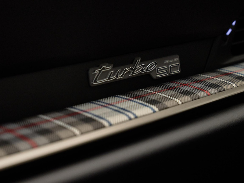 Interieur Leder zwart met Tartan-inleg XXX: Adaptieve sportstoelen Plus (elektrisch 18-voudig) met memory pakket XXX: Sport Chrono Pakket met specifieke 'turbo 50' Porsche Design Subsecondenklok 6NN: Hemelbekleding alcantara 2ZF: Verwarmd GT sportstuur Race-Tex 3L4: Stoelverstelling, elektrisch, voor beide voorstoelen, bestuurdersstoel met geheugen Q1J: Sportstoelen vóór 3FE: Elektrisch bedienbaar glazen schuifdak BST: Heritage Design pakket 50 Years Turbo (detailbenaming) XXX: Bekleding stuurkolom leder (in combinatie met memory pakket) XXX: PDK keuzehendel aluminium XXX: Lichtgewicht en geluiddempend glas XXX: Zelfdimmende binnen- en buitenspiegels met regensensor XXX: Elektrisch inklapbare buitenspiegels