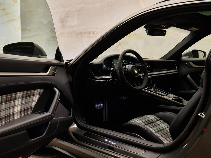 Interieur & Comfort Het interieur in zwart leder met Tartan-accenten ademt nostalgie, terwijl moderne luxe aanwezig is in de vorm van het verwarmde GT-sportstuur in Race-Tex (2ZF) en het hoogwaardige Burmester® High-End Surround Sound System (9VJ) voor een ongeëvenaarde geluidsbeleving.
